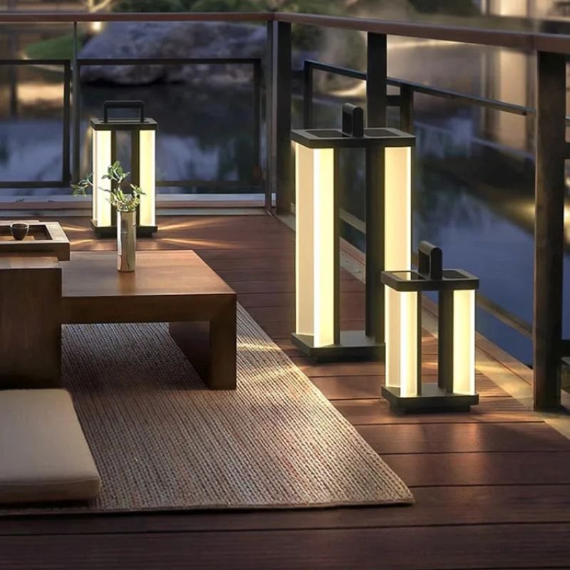 Three illuminated "Villa Solar Lamps" of different sizes stand on a wooden deck near a low table with a vase and a woven rug, overlooking a dark body of water at night.