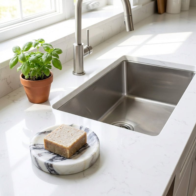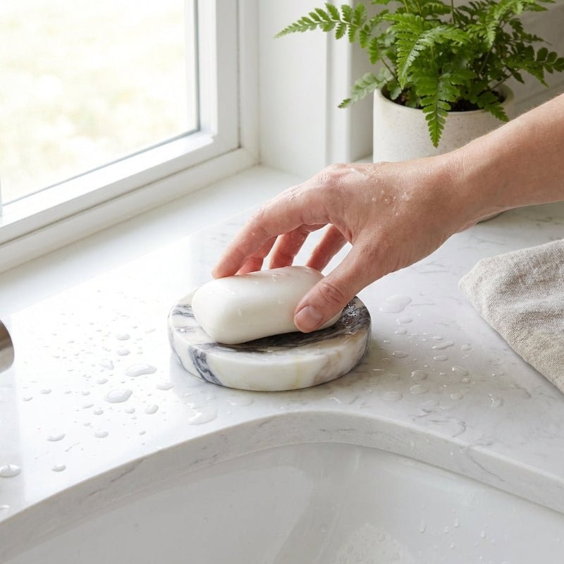 Add timeless elegance to your space with this Calacatta marble soap dish. Crafted from natural stone with a smooth polished finish, it keeps countertops tidy while bringing a refined touch to bathrooms, vanities, or kitchen sinks.