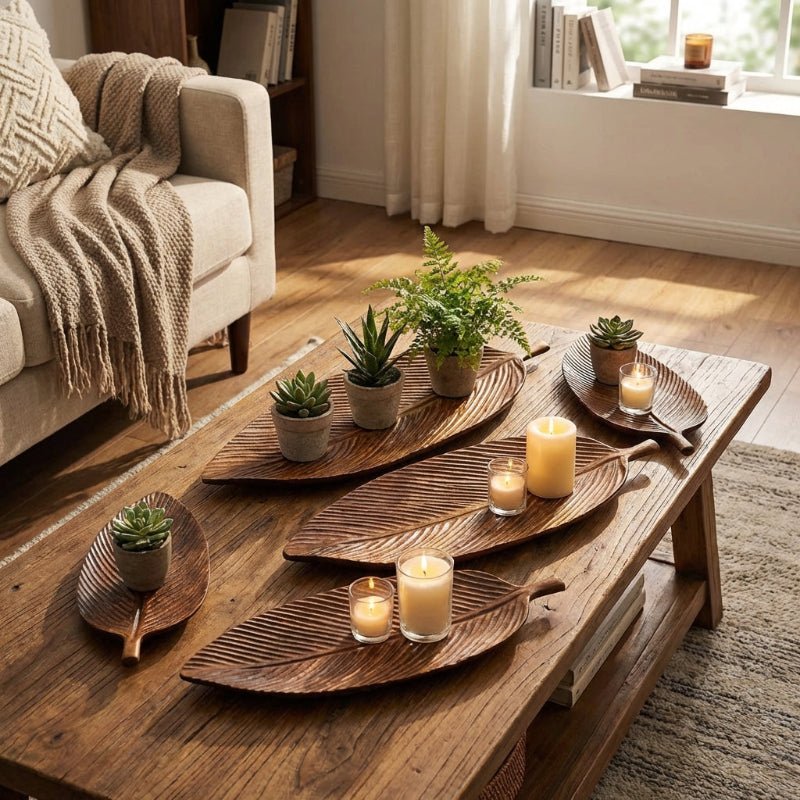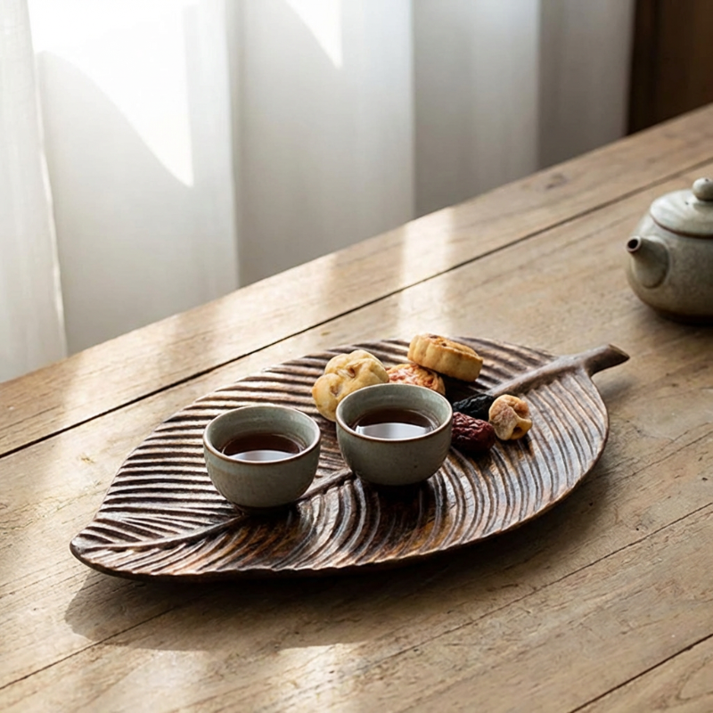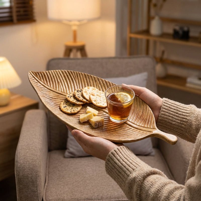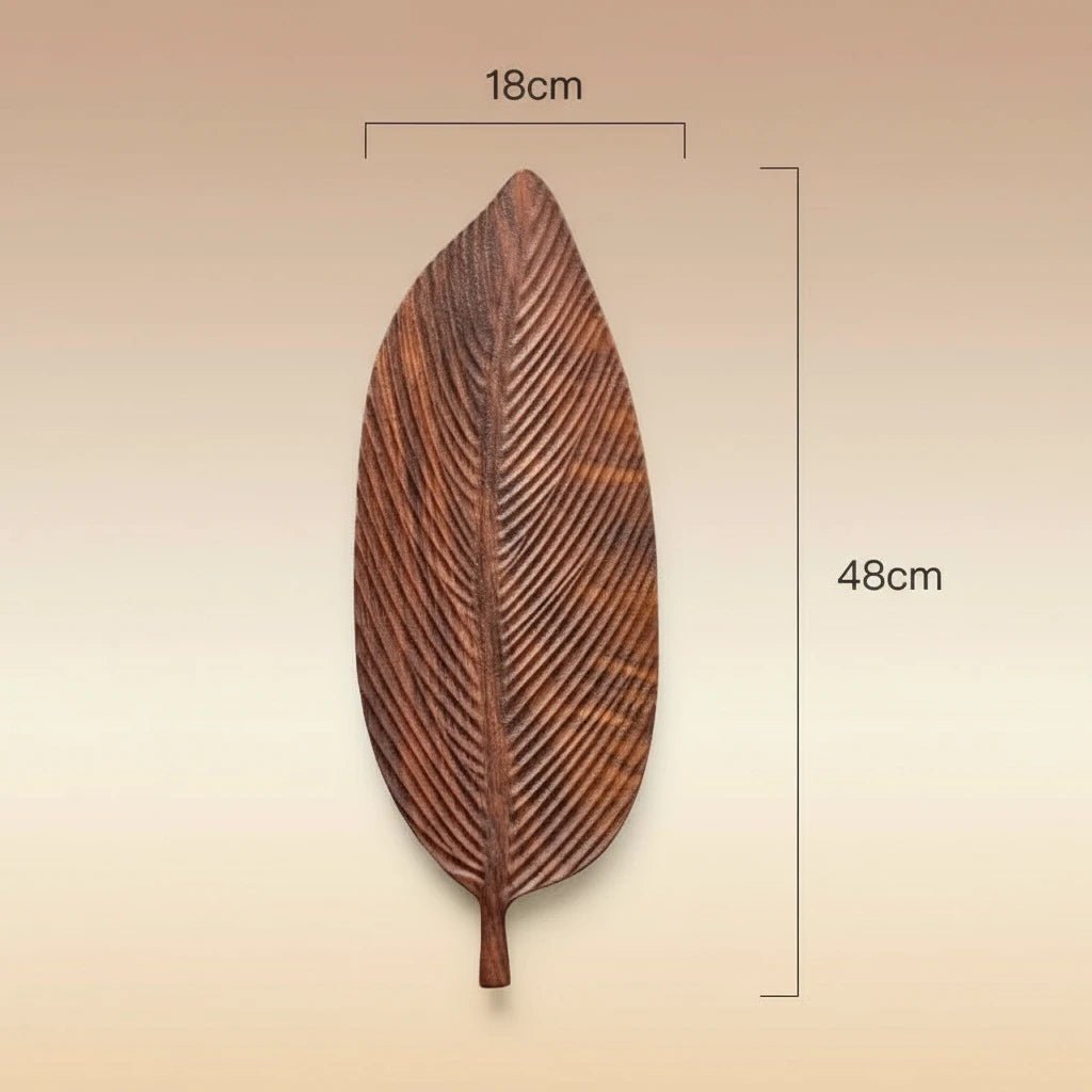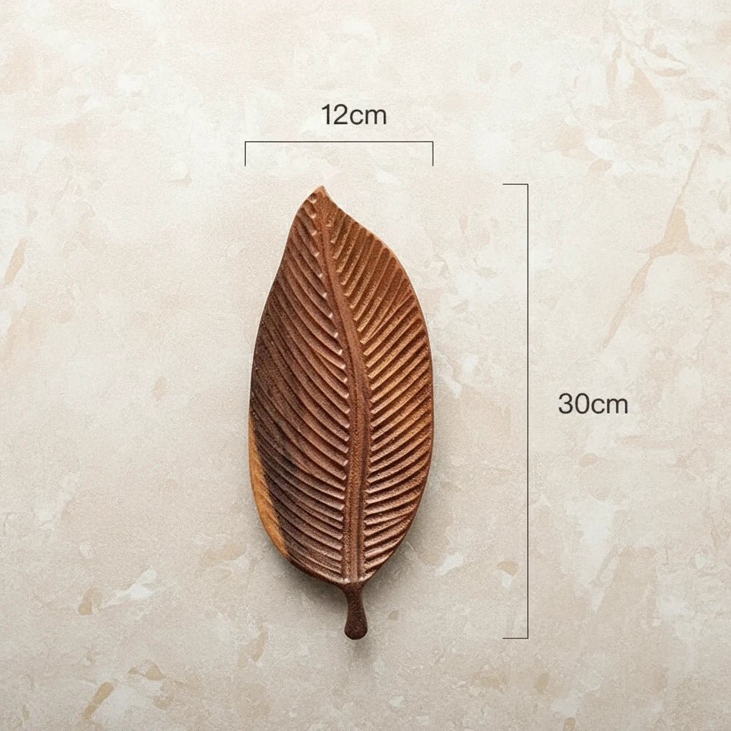 Bring organic elegance to your table with this carved wood leaf serving tray. Hand-carved from solid wood with a graceful leaf silhouette, it adds natural warmth while beautifully serving tea, fruit, snacks, or desserts.