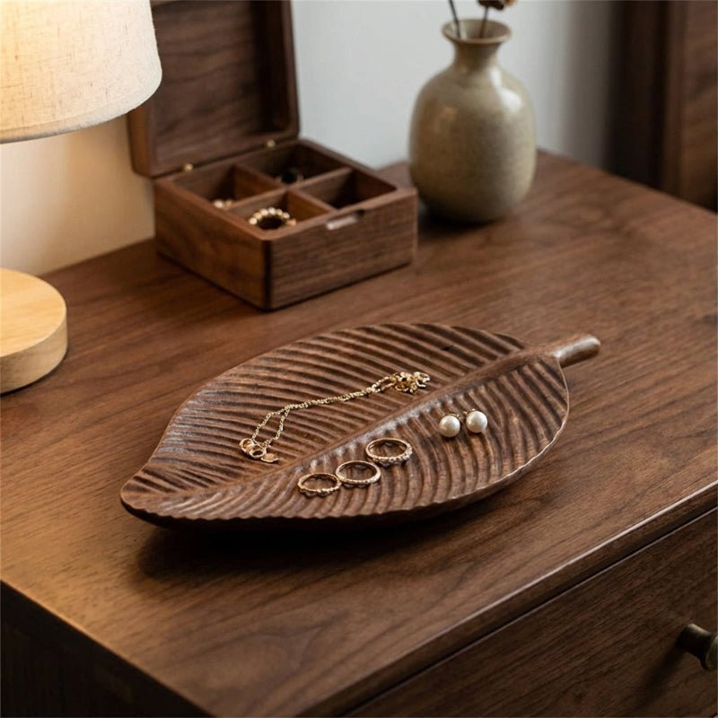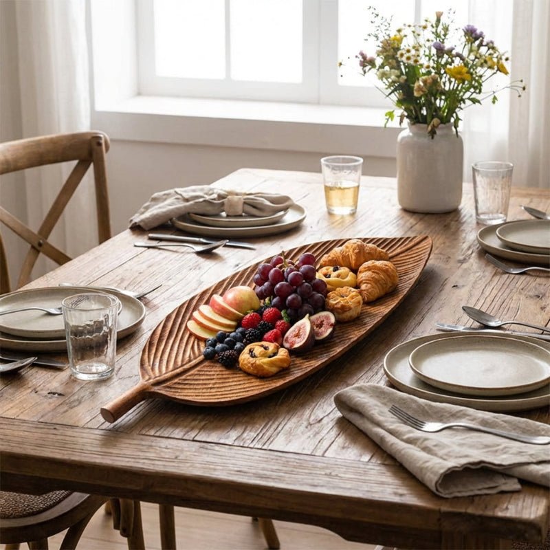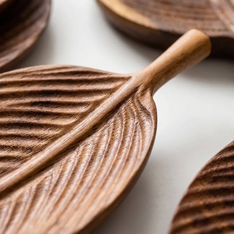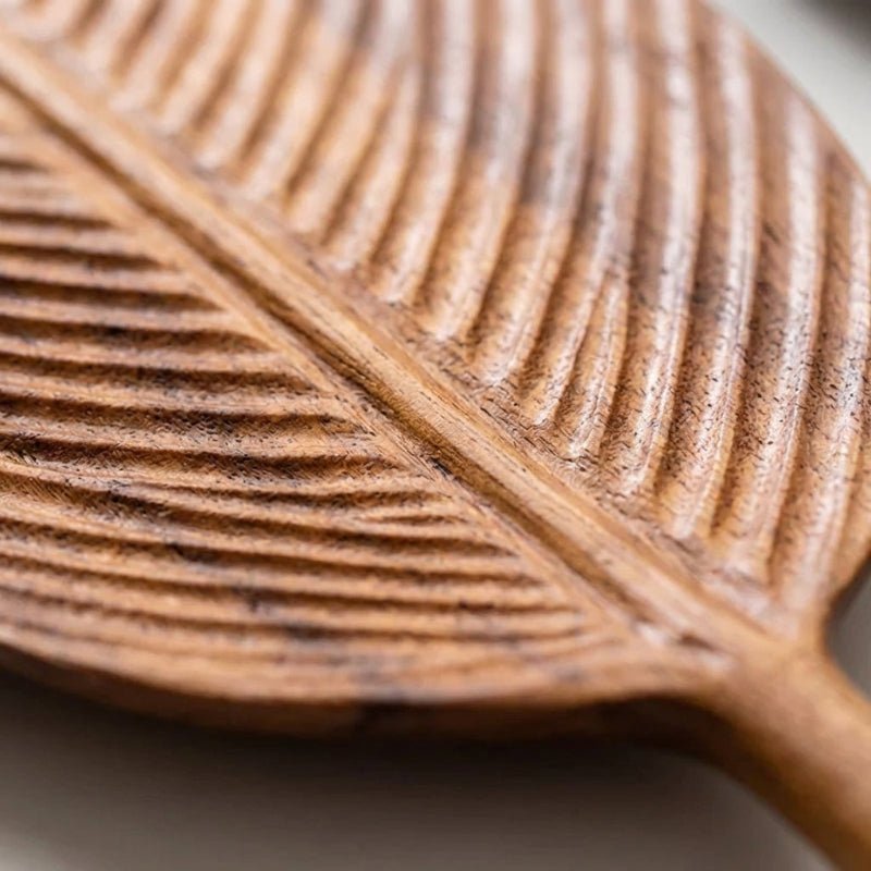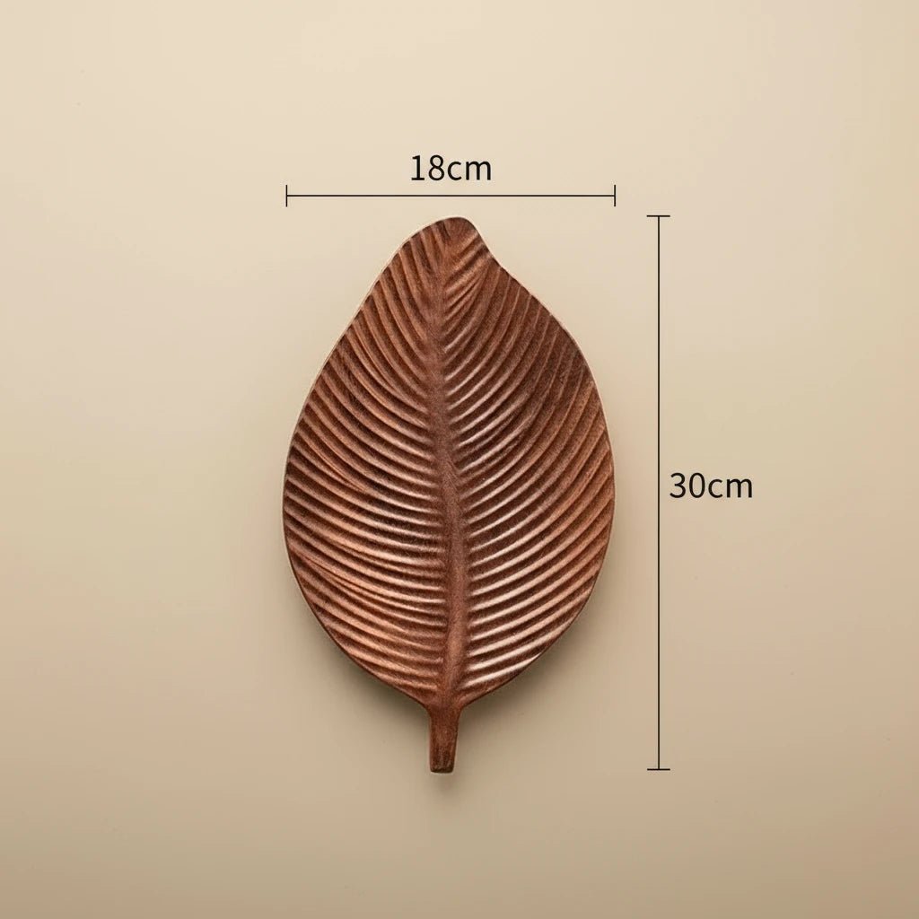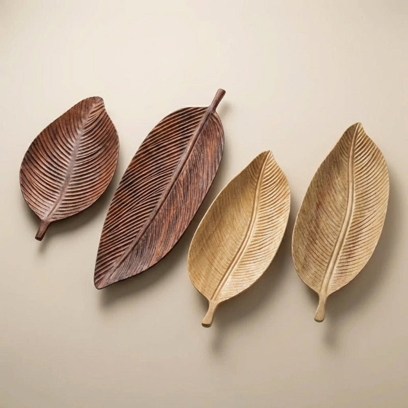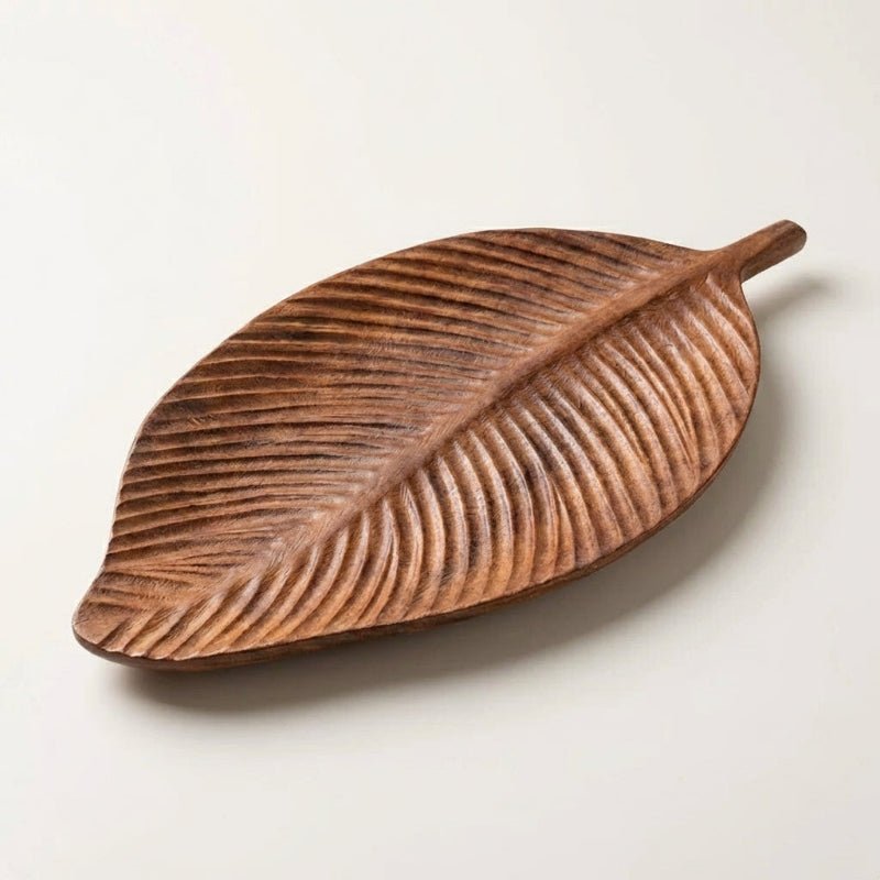 - Hand-carved solid wood serving tray with organic leaf shape