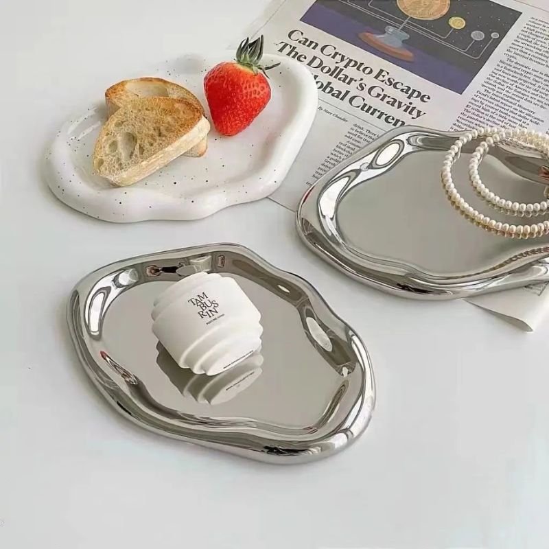 Two irregularly shaped trays, one white with food and one silver with a jar and jewelry, on a table with a newspaper.