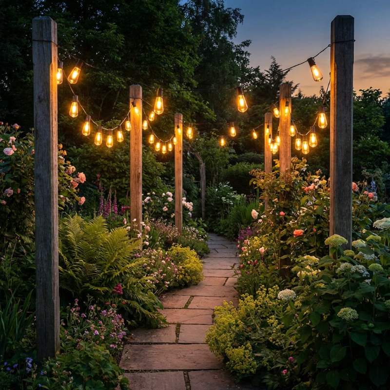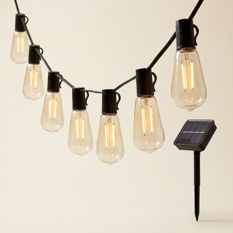 • Solar-powered Edison bulb string lights with warm ambient glow