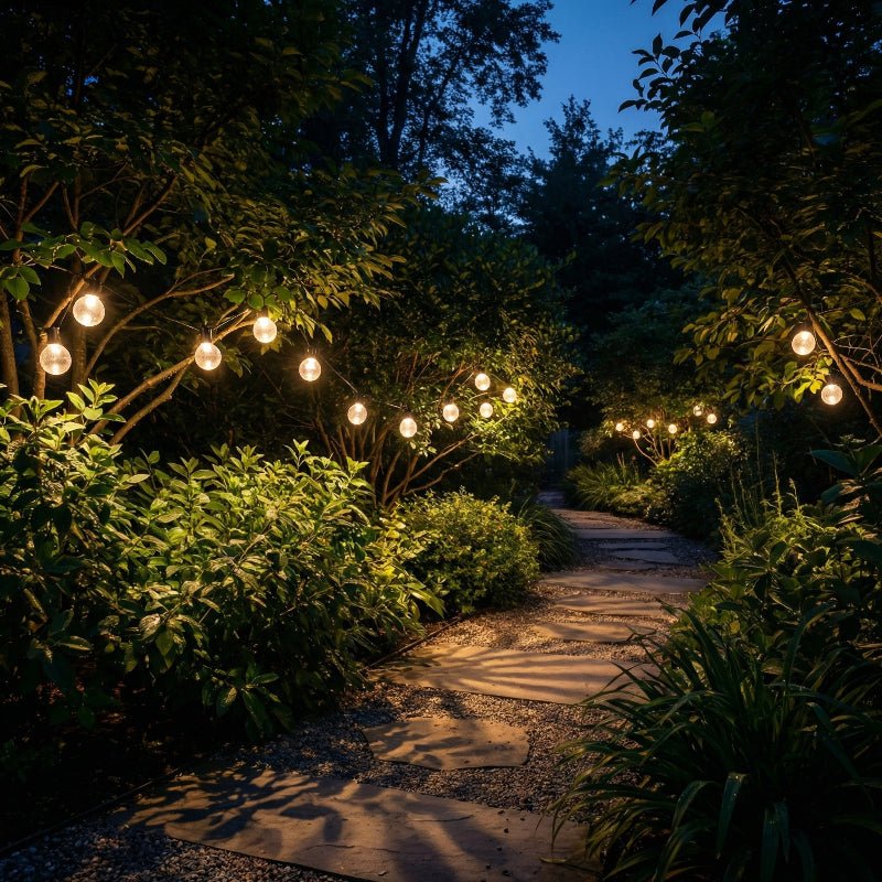 - Solar-powered outdoor string lights with warm LED glow