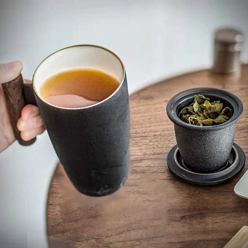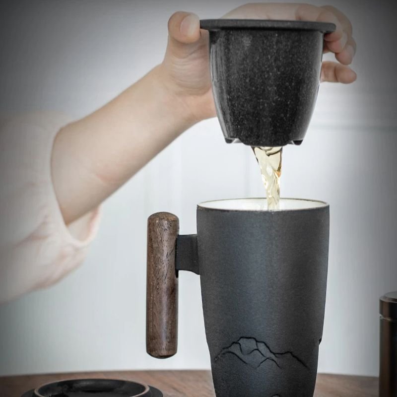 A sleek black ceramic thermal mug with a wooden handle, held by a person in a white sleeve, filled with warm tea. A matching black tea strainer with loose tea leaves sits on a wooden tray. A laptop is visible in the background.