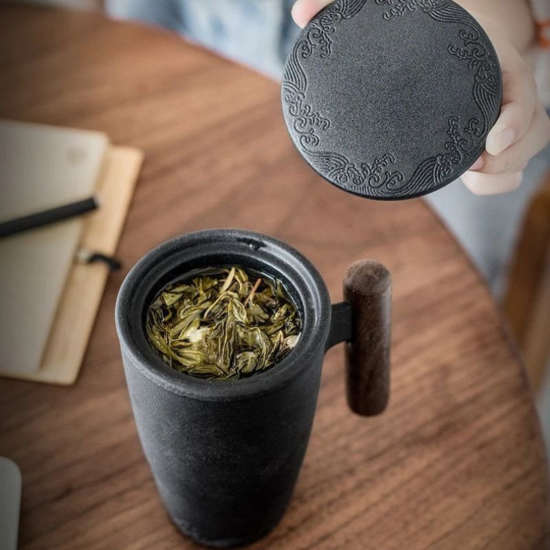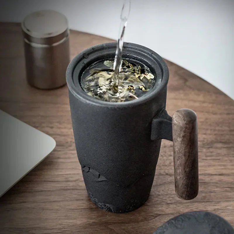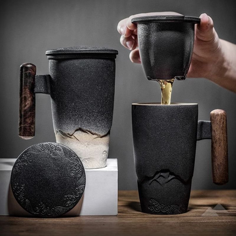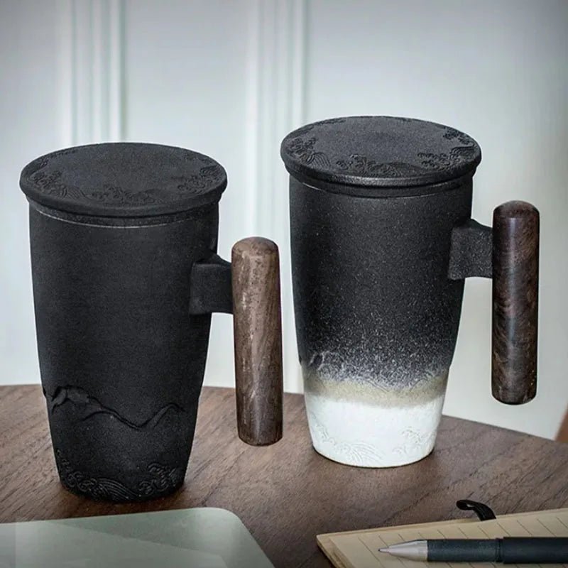 Elegant black ceramic thermal mugs with wooden handles, featuring intricate engraved designs. One mug is placed on a white block, while another is being used with a matching lid and tea strainer, pouring golden tea.